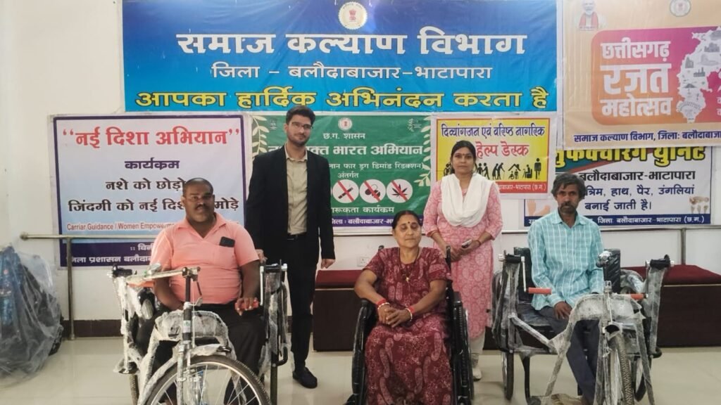 बलौदाबाजार, 30 जनवरी 2026/ कलेक्टर दीपक सोनी ने शुक्रवार को दिव्यांगजन को समाज कल्याण विभाग के माध्यम से 5 दिव्यांगजनों को सहायक उपकरण प्रदान किया।बलौदाबाजार विकासखण्ड अंतर्गत ग्राम धौराभाठा के राजन धीवर एवं सेम्हराडीह के जनीराम गिरी को हस्त चलित ट्रायसायकल, विकासखंड पलारी अंतर्गत ग्राम अहमदपुर लक्ष्यदीप बंजारे एवं सिमगा विकासखण्ड अंतर्गत कचलोन के रुद्रकुमार चेलक को श्रवण यंत्र एवं नगर पालिका बलौदाबाजार निवासी रुखमणी साहू को व्हीलचेयर प्रदान किया गया। सहायक उपकरण मिलने पर दिव्यांगजनों ने प्रसन्नता व्यक्त करते हुए कहा कि अब उनको रोजमर्रा के कार्यों एवं बाहर आने -जाने में आसानी होगी। ट्रायसिकल, श्रवण यंत्र एवं व्हीलचेयर मिलने पर उन्होंने शासन एवं प्रशासन को धन्यवाद दिया।इस अवसर पर उप संचालक सिनीवाली गोयल एवं विभाग के अन्य अधिकारी -कर्मचारी उपस्थित थे।