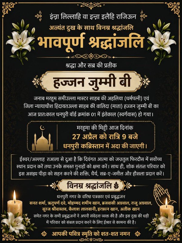 धनपुरी (शहडोल)। अत्यंत गहन दुःख, अपार वेदना एवं रंजो-ग़म के साथ यह शोक-सूचना दी जाती है कि ज़नाब मरहूम समीउल्ला मास्टर साहब की अहलिया (धर्मपत्नी) तथा ज़िला न्यायाधीश जनाब हिदायतउल्ला साहब की वालिदा (माता) हज्जन जुम्मी बी का आज प्रातःकाल धनपुरी वार्ड क्रमांक 01 में इंतिक़ाल (स्वर्गवास) हो गया। उनके देहावसान का यह करुण समाचार समूचे क्षेत्र में शोक, संवेदना और गहरी स्तब्धता का वातावरण निर्मित कर गया है।